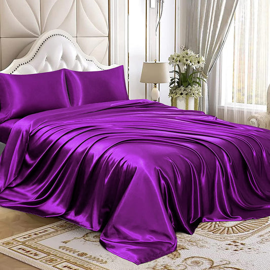 Luxury 4-Piece Silky Satin Flat Fitted Sheets Pillowcase Bed Set (Purple, Queen)