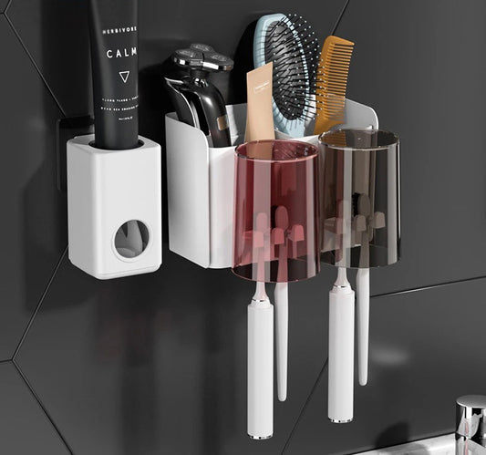 4-Cup Toothbrush Holder Rack and Automatic Toothpaste Dispenser Bathroom Organiser Set
