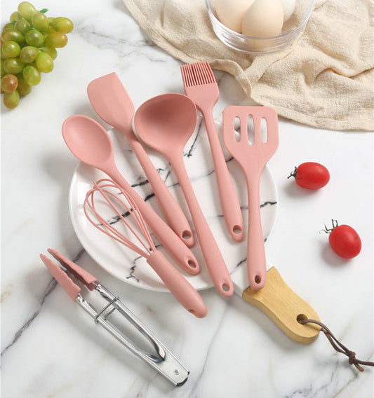 8PC Silicone Kitchen Cooking Utensil Set Non-stick Cookware Tools with Holder (Pink)