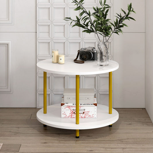 Gem Round White Wood Metal Round End Coffee Table with Storage Shelf