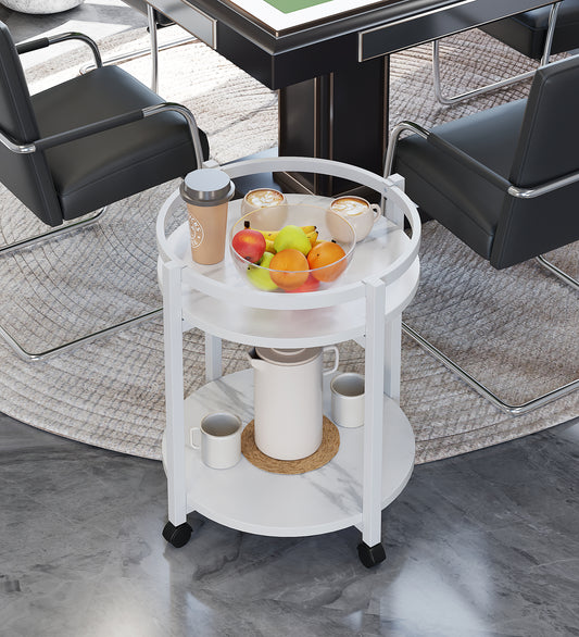 Amity Round Sofa Bed Side Coffee Table with Shelves and Wheels (White)