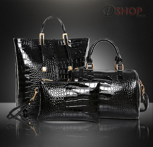 3 PCS Luxe Faux Crocodile Leather Handbag Set, Large Tote, Shoulder Bag, Purse Wallet (Black)