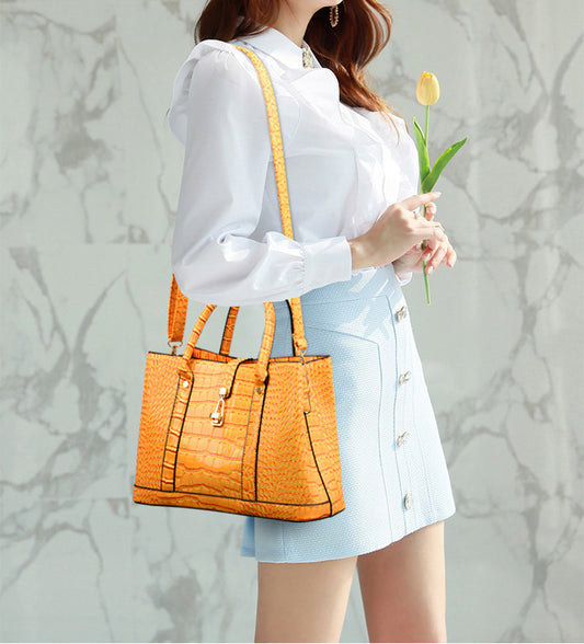 3 PCS Luxe Faux Crocodile Leather Handbag Set, Large Tote, Shoulder Bag, Purse Wallet (Yellow)