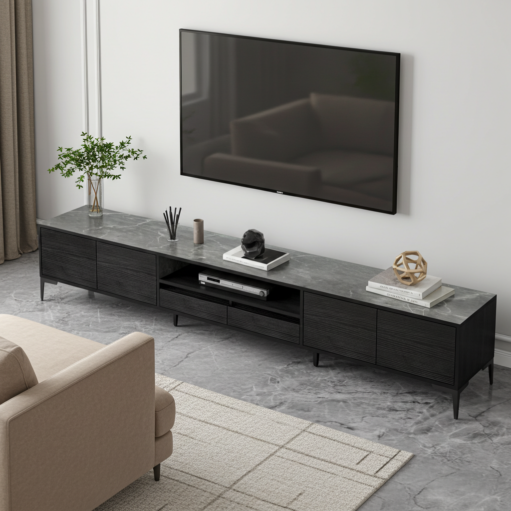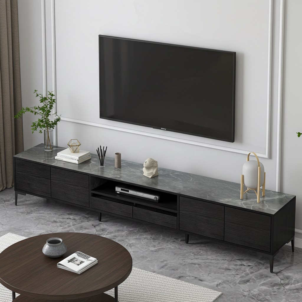 Deciding between storage and style in the living room? Get both with this 200cm long modern TV console. Ideal for a great media centrepiece of your living area, this elegant entertainment centre adds style and function to your space. It features a marble look finish and ample storage, making this modern media console both a storage piece and a work of art.
