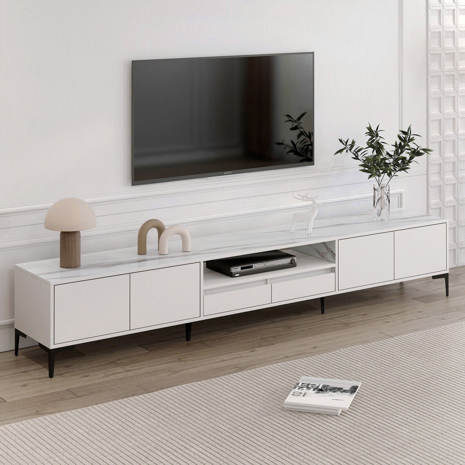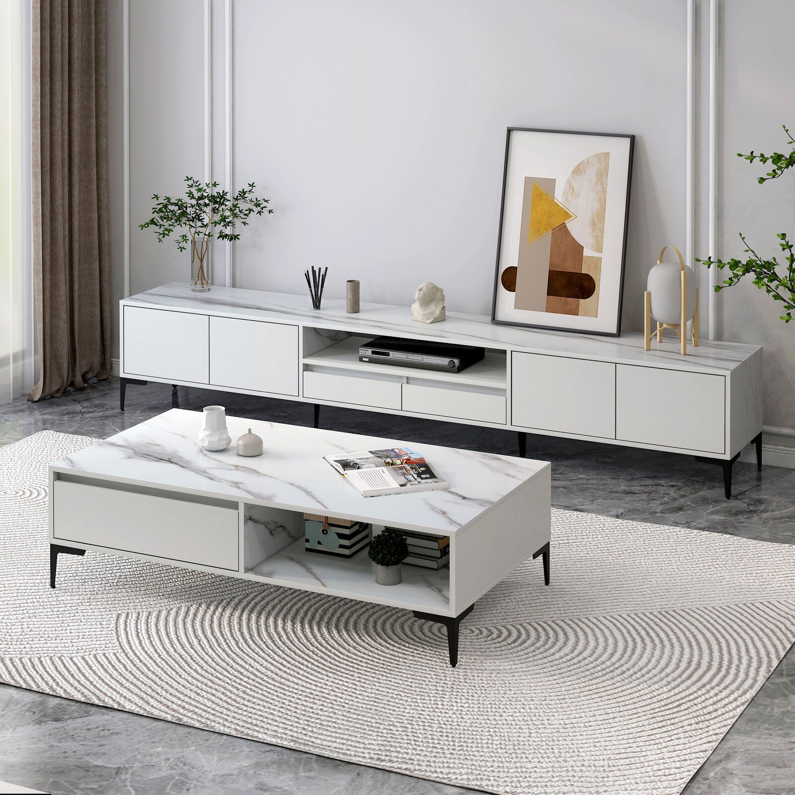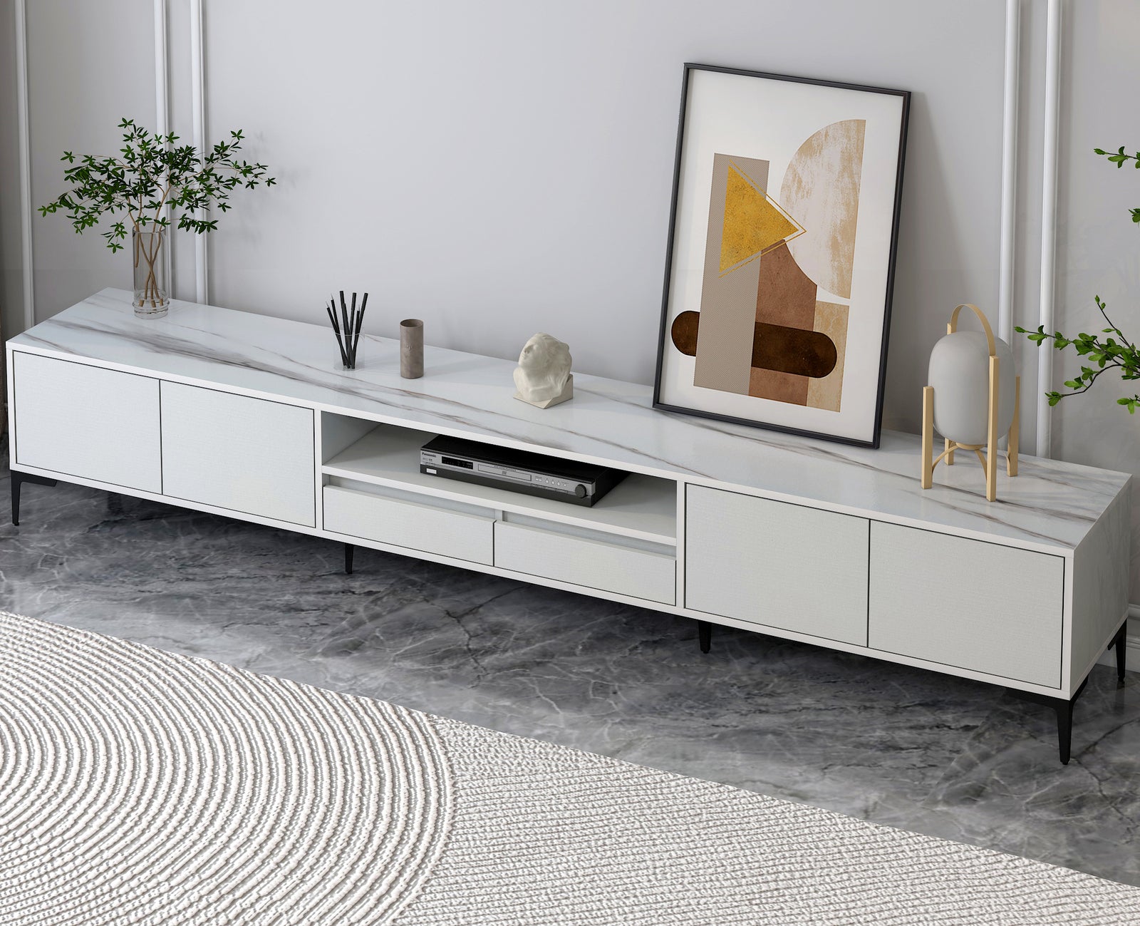 Deciding between storage or style in the living room? Get both with this 200cm long modern TV console. Ideal as a great media centrepiece for your living area, this elegant entertainment centre adds style and function to your space. It features a marble look finish and ample storage, making this modern media console both a storage piece and a work of art.