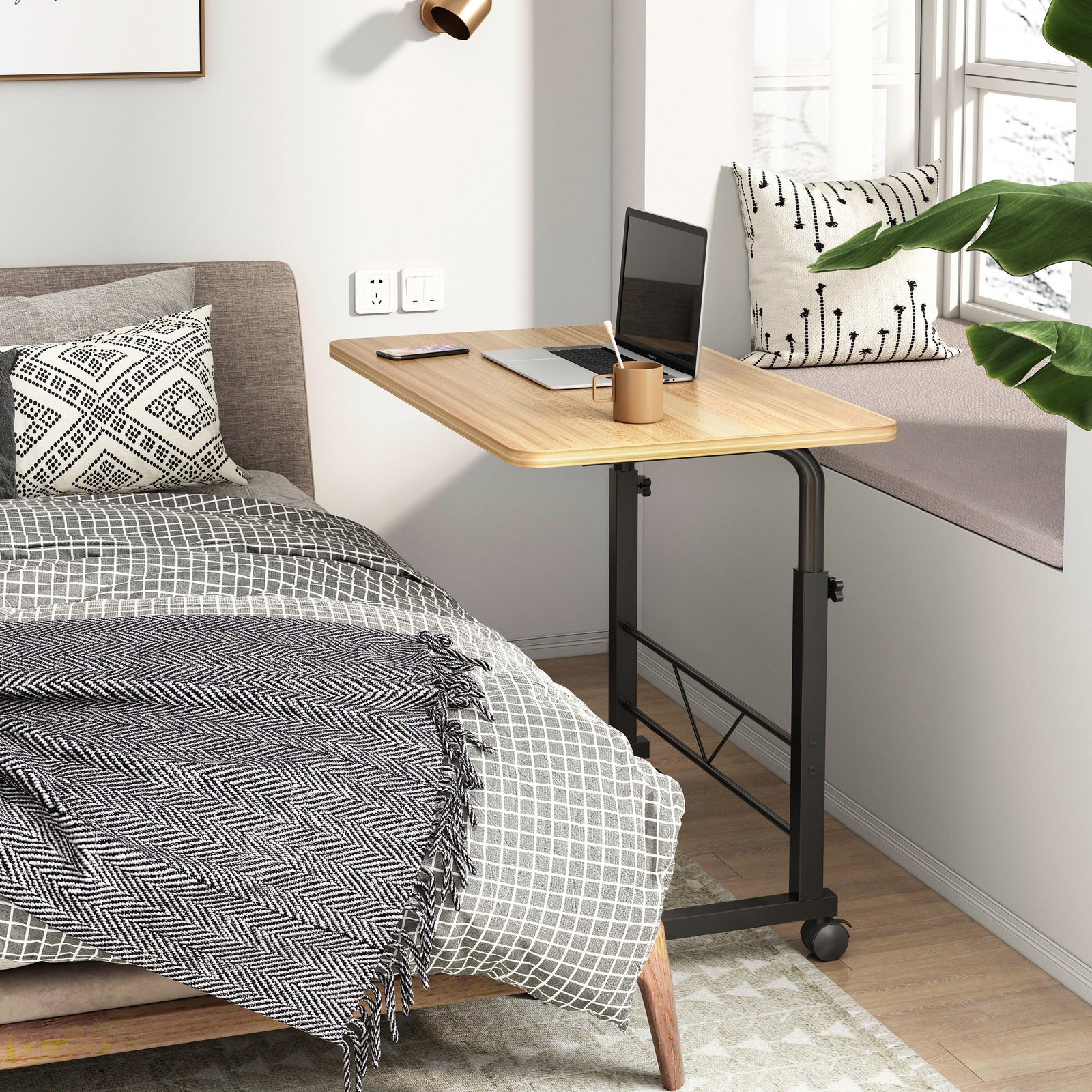 Introducing the Adjustable Sofa Bed Side Table Laptop Computer Desk - a sleek and modern desk that combines the sophistication of steel with the warmth of wood. This unique and elegant piece is stylish, modern, yet simple - making it the perfect addition to any home or office. One of the best features of this desk is its adjustable height, providing extra convenience for any use. With its 4 wheels, it's incredibly easy to move around, making it perfect as a sofa/bedside table, laptop/computer desk, or more. You'll enjoy its versatility and convenience, allowing you to use your space in a smart way, with comfort and style.