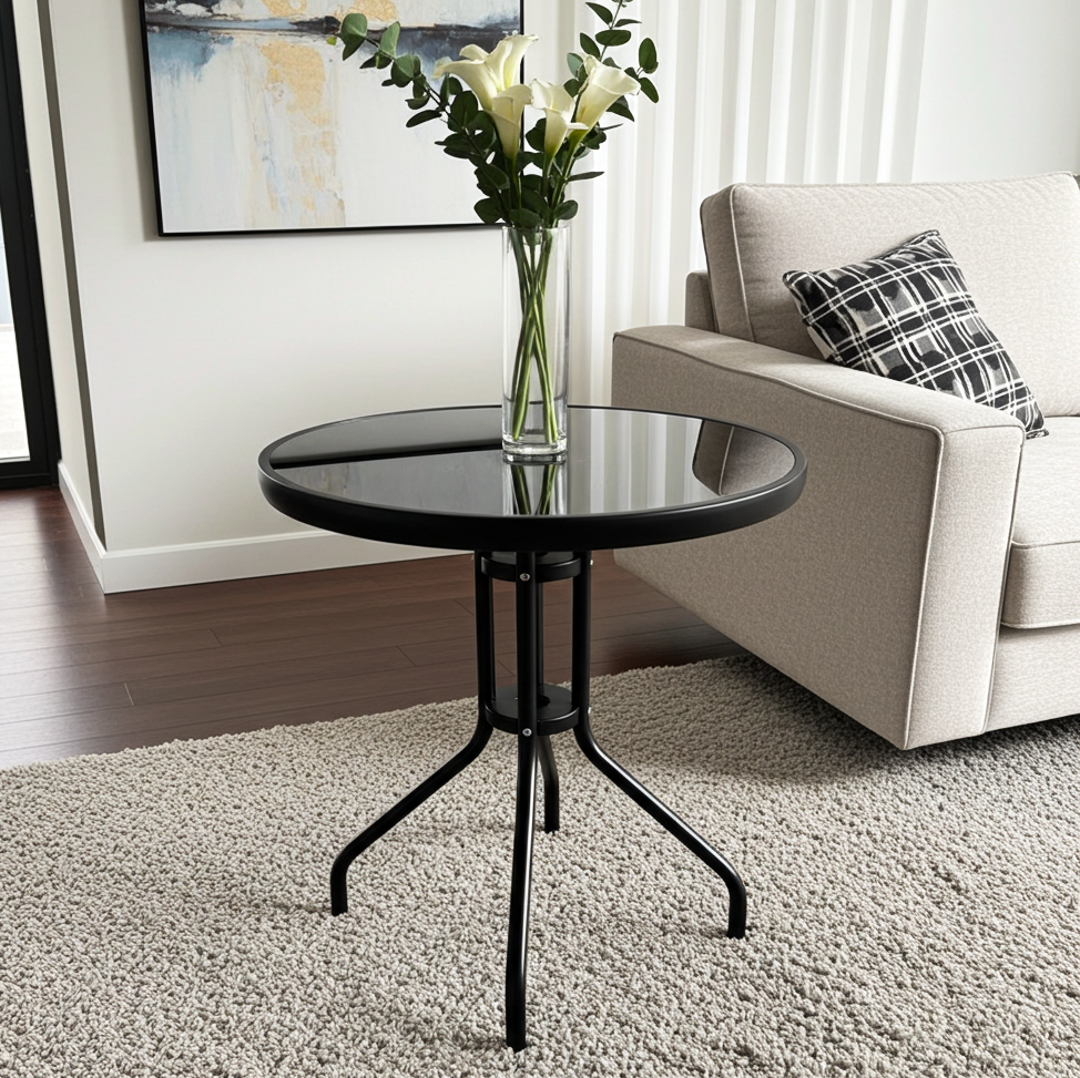 CLEARANCE SALE! The round glass table boasts an elegant contemporary design, making it an ideal choice for enhancing any indoor or outdoor living space with a touch of modern sophistication. Perfect for use on covered verandas, decks, patios, and more, this versatile table combines style and functionality.