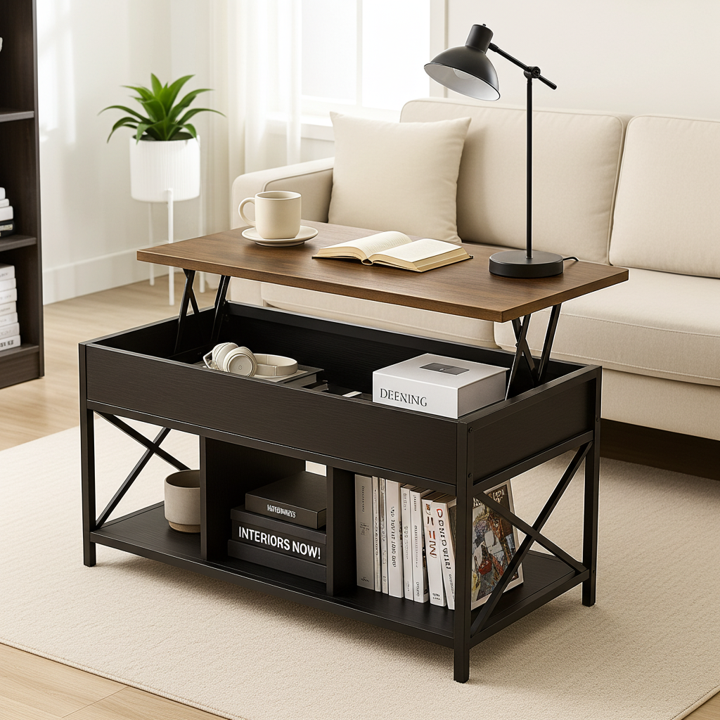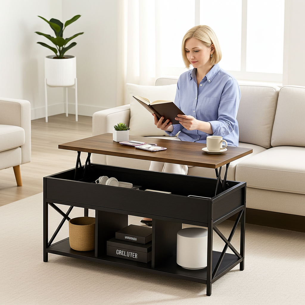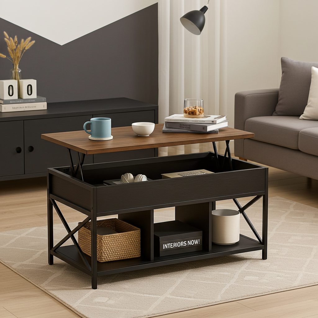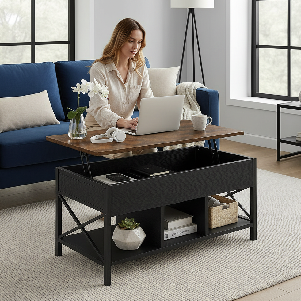 Bring style, practicality and versatility into your living space with this Lift-Top Coffee Table with Storage. Designed with a rich rustic wood tabletop and a sleek black frame, this multi-functional piece effortlessly combines modern elegance with industrial charm.