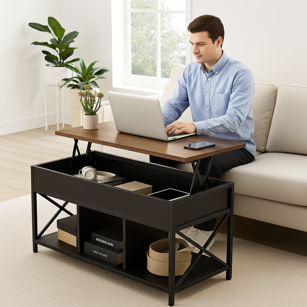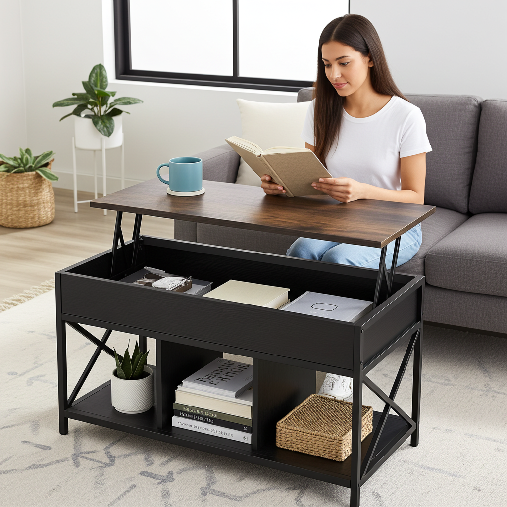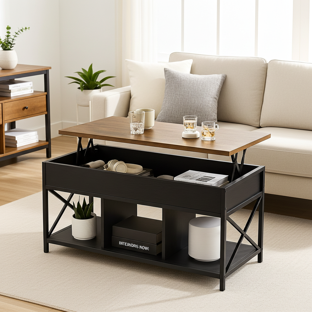 Bring style, practicality and versatility into your living space with this Lift-Top Coffee Table with Storage. Designed with a rich rustic wood tabletop and a sleek black frame, this multi-functional piece effortlessly combines modern elegance with industrial charm.