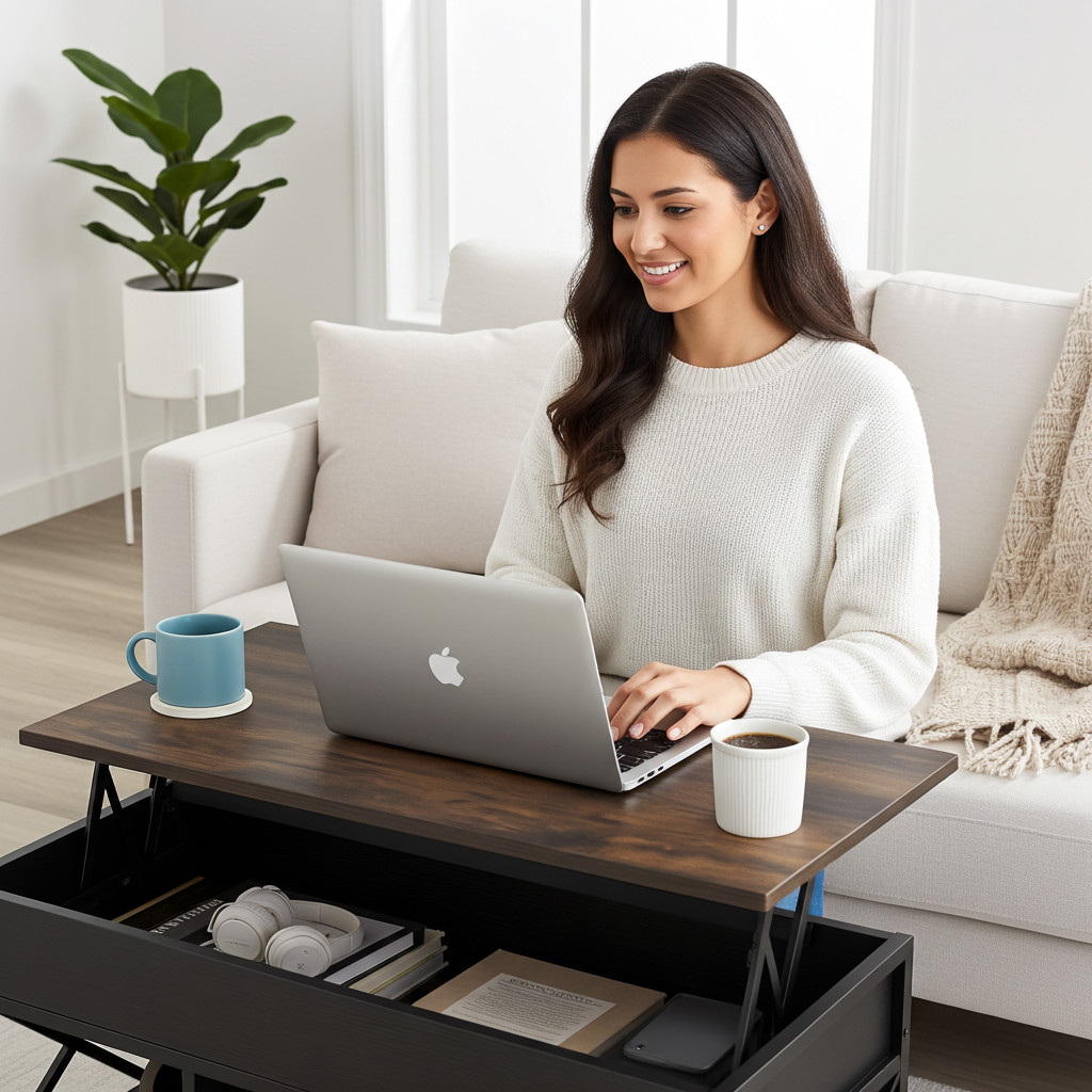 The smart lift-top design transforms your table into a raised work surface in seconds, perfect for working from the couch, casual dining, or entertaining guests. Beneath the tabletop is a spacious hidden compartment to store everyday items like remotes, chargers, books or games. The open shelving below offers additional room for displaying décor, storing baskets or keeping frequently used items within easy reach.