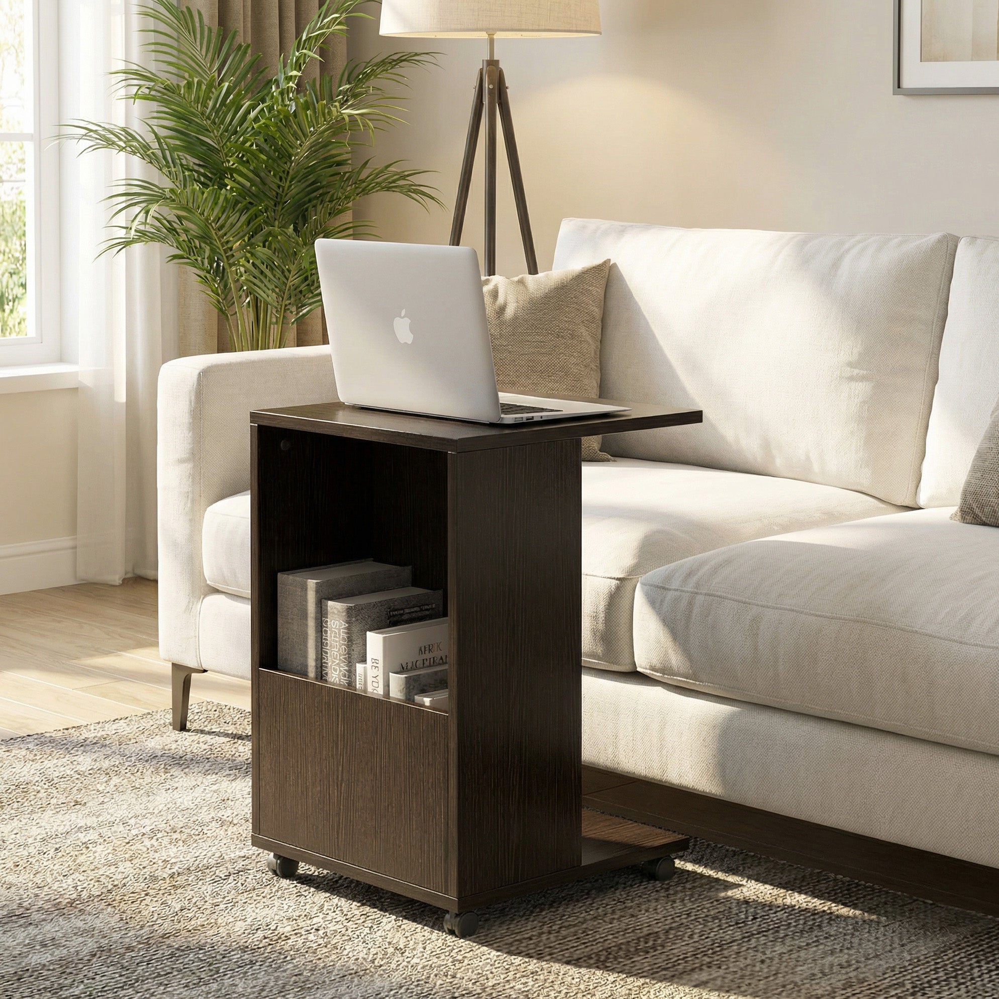 The Varossa Versatile Side Table with Magazine Holder / Computer Desk is stylish, elegant, and versatile. It has multiple uses, from a versatile side desk to a book/magazine/display shelf to a laptop computer desk to a handy bedside. Unique double shelving design for convenience and extra storage. It provides ample space for drinks and snacks, magazines, books, and more. One side easily slides under a sofa or bed.