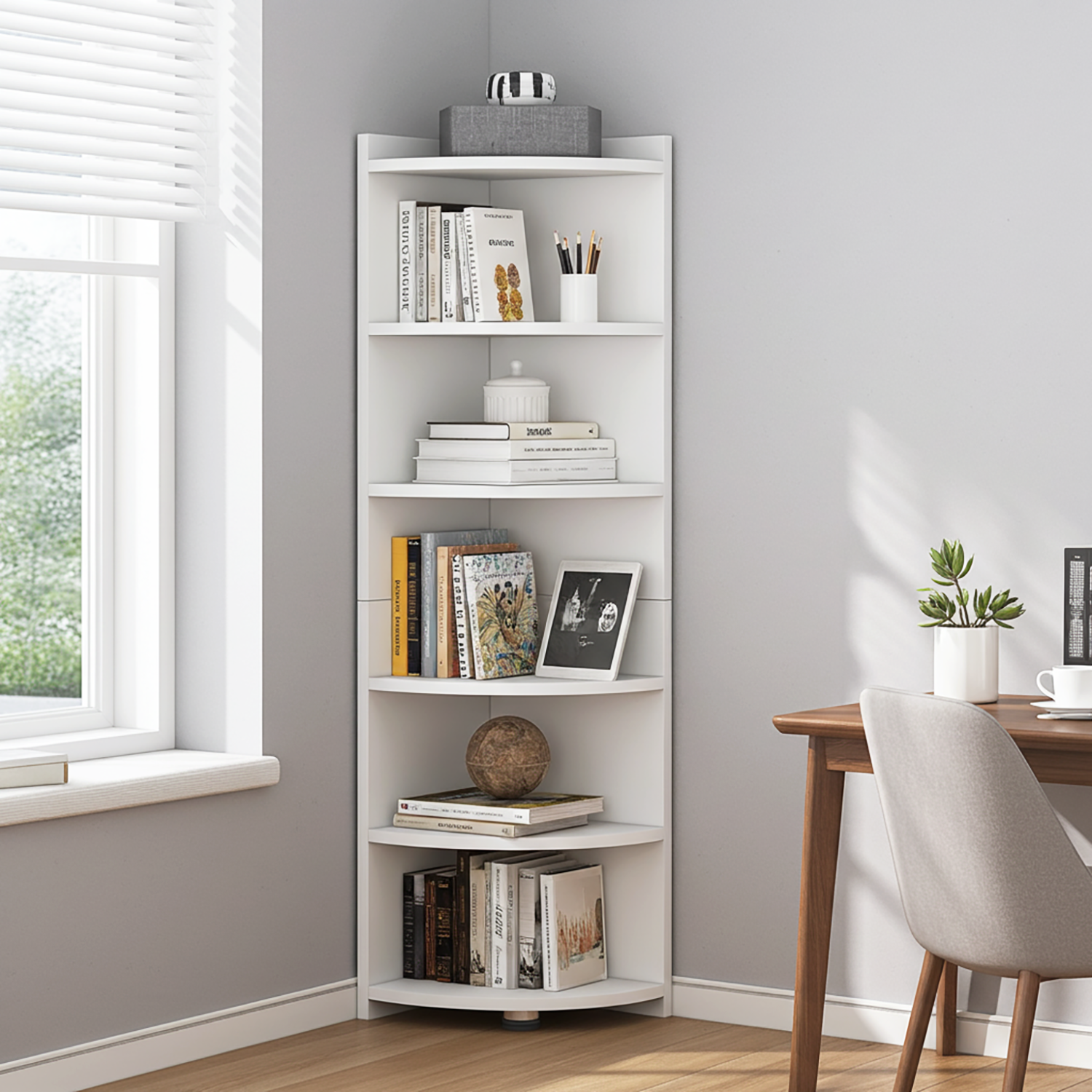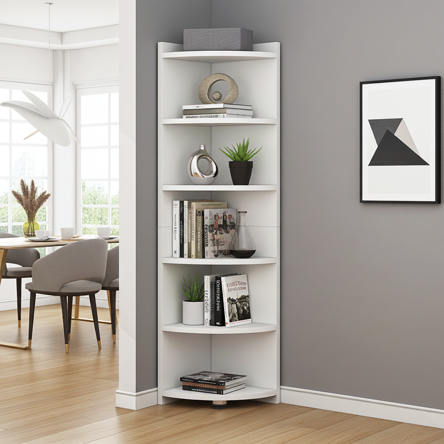 The Corner Shelf offers easy storage access with six generous tiers, thoughtfully designed to meet your space needs while providing durable and practical furniture. Crafted from MDF wood, this sleek and trendy corner shelving unit blends charm and functionality, making it an ideal choice for any living space.