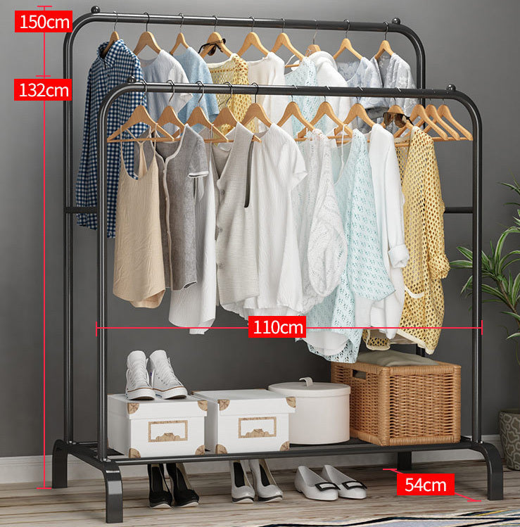 Organize with the elegantly designed Double-Rack Coat Stand Wardrobe for extremely practical storage space. This innovative piece looks great in the hallway, guest room, or master bedroom, providing easy access to essential accessories. It features multiple hanging racks, hooks, and extra hanging space. The timeless design is truly versatile and can be integrated wonderfully with a wide variety of furniture and decor or used as an overall design concept. Stylish and highly functional, this designer coat stand relieves clutter and organizes your home in style.