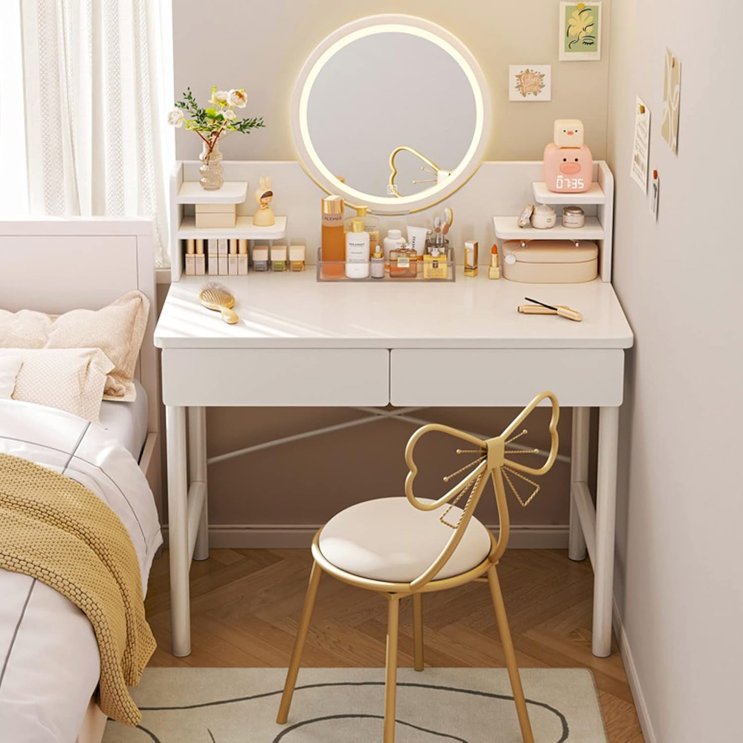 Turn your beauty routine into a daily dose of luxury with this airy white makeup vanity. The glowing round LED mirror sets the scene, while smart double shelving and twin drawers keep every favourite neatly sorted. Perfect for bedrooms, teen retreats and stylish apartments, it delivers designer looks without taking over your space.