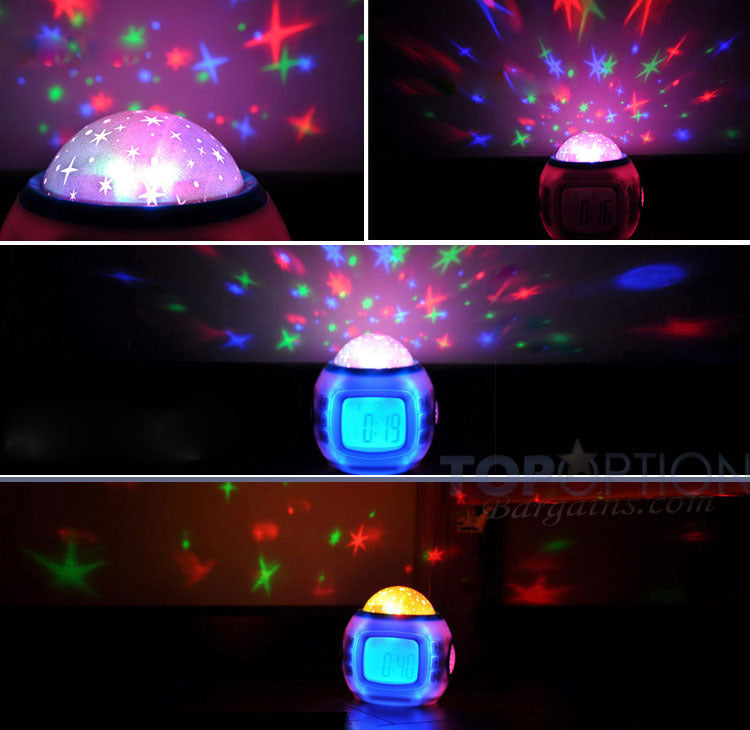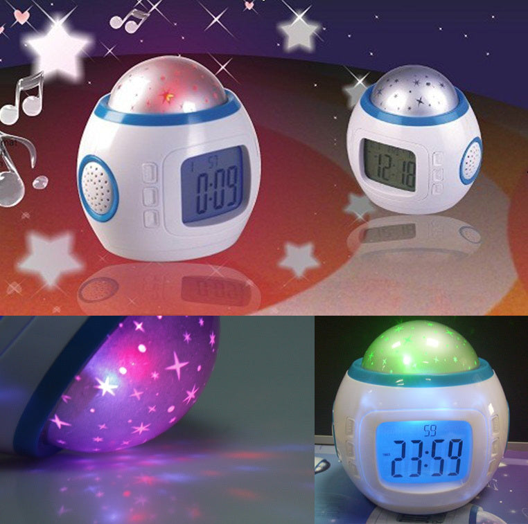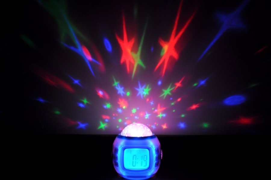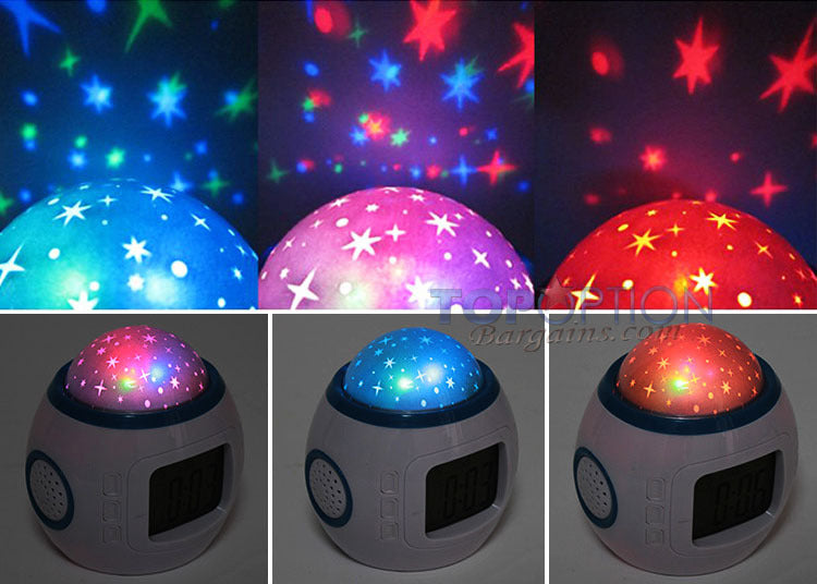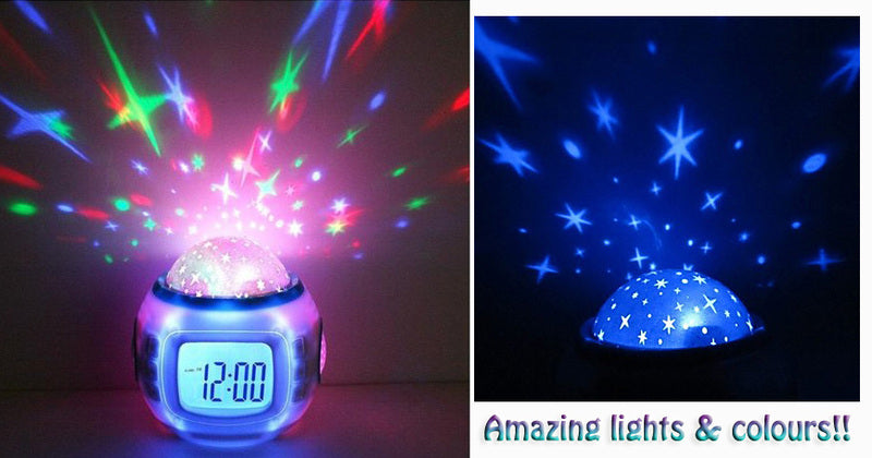 This amazing digital alarm clock and calendar can project beautiful images of a starry sky while playing 10 different tones. The lights and colors change to the tempo of the music. This clock is a great choice for a party night, a relaxing evening, or the kid's bedroom.