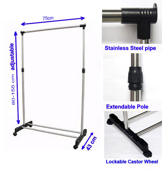 Keep your clothes organized with this deluxe portable clothes hanger rack. The strong and steady frame is made from 100% high-quality stainless steel. With adjustable height and set on casters, this rack is perfect for extra hanging space. It also provides easy access to clothes. Sturdy and durable, this multifunctional clothes rack will hold a large load of clothes with its strong metal frame and two crossbars at the bottom to prevent swaying. The height-adjustable and mobile design makes this clothes rack the perfect storage or display solution. It has removable caster wheels, so you can move it around easily and quickly, making it ideal for taking with you on the go!