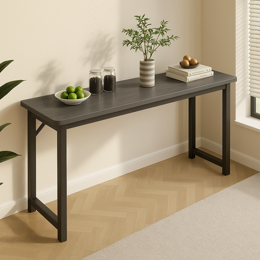 Transform your home with this sleek, contemporary console table, combining minimalist design with practical functionality. The sophisticated wooden top offers a clean, durable surface for your essentials or as a streamlined desk, while the sturdy metal frame ensures lasting stability. Ideal for a variety of spaces, this table brings modern style and versatility wherever it's placed.