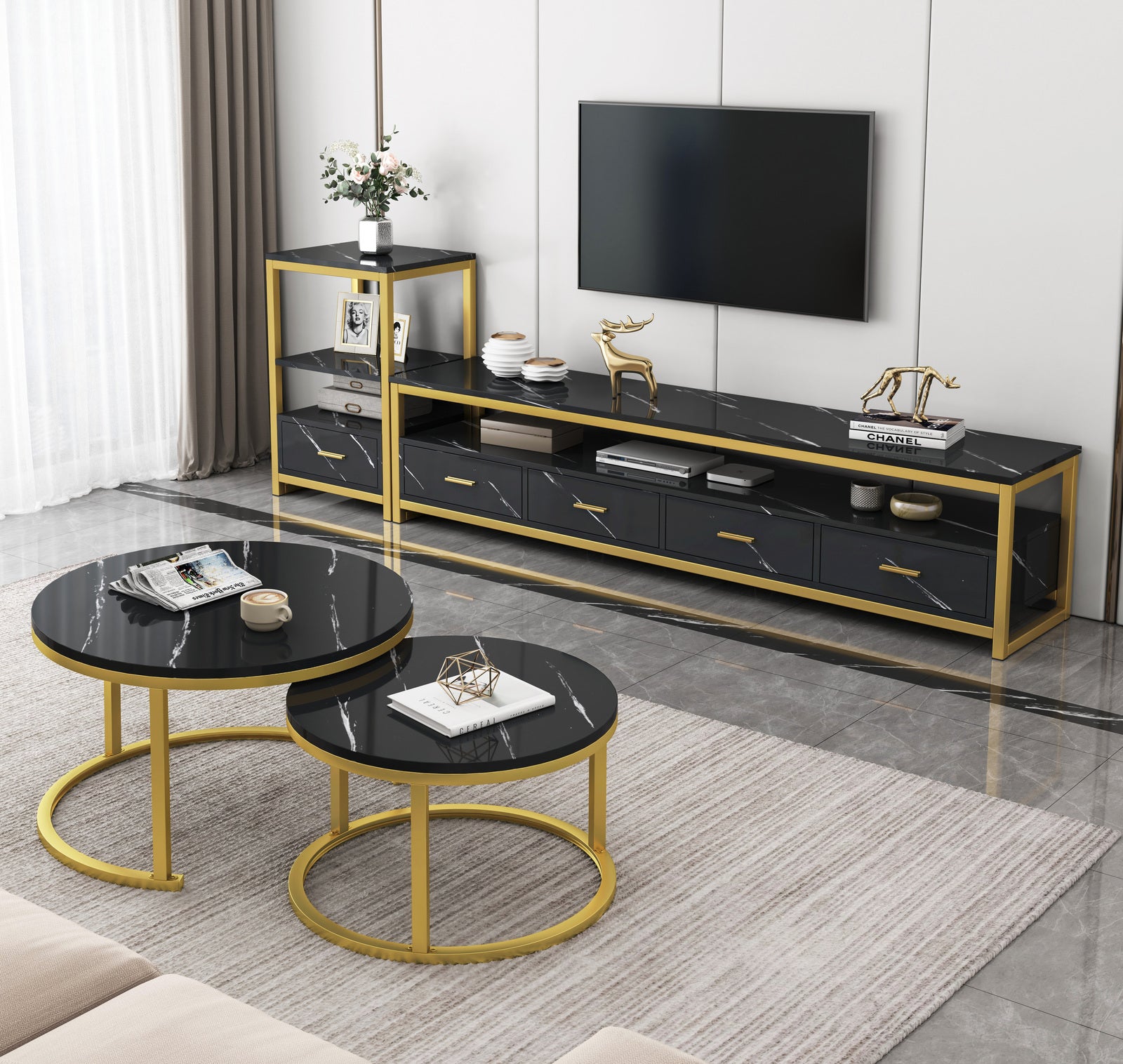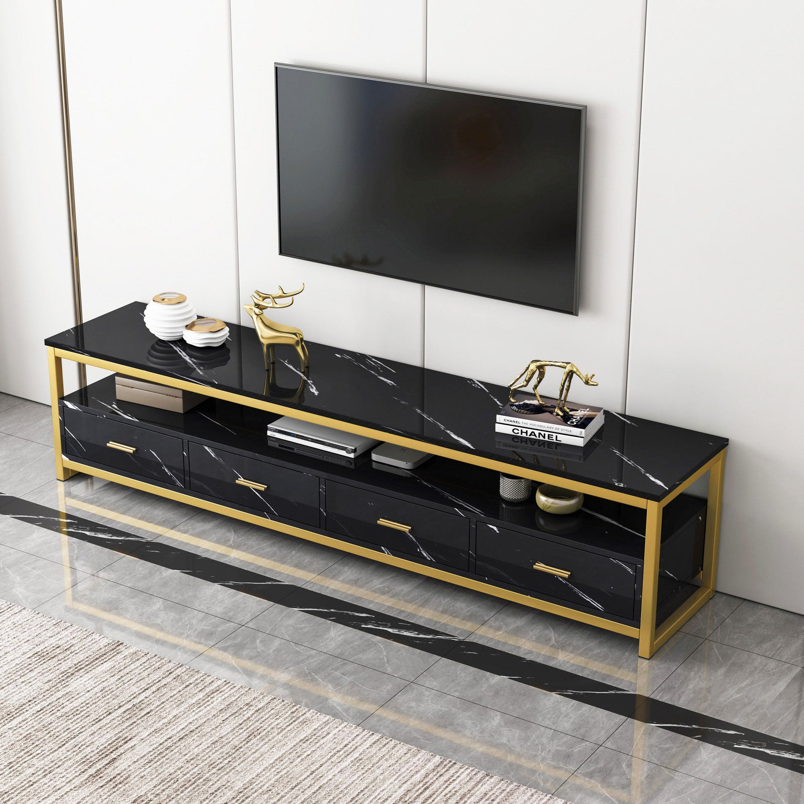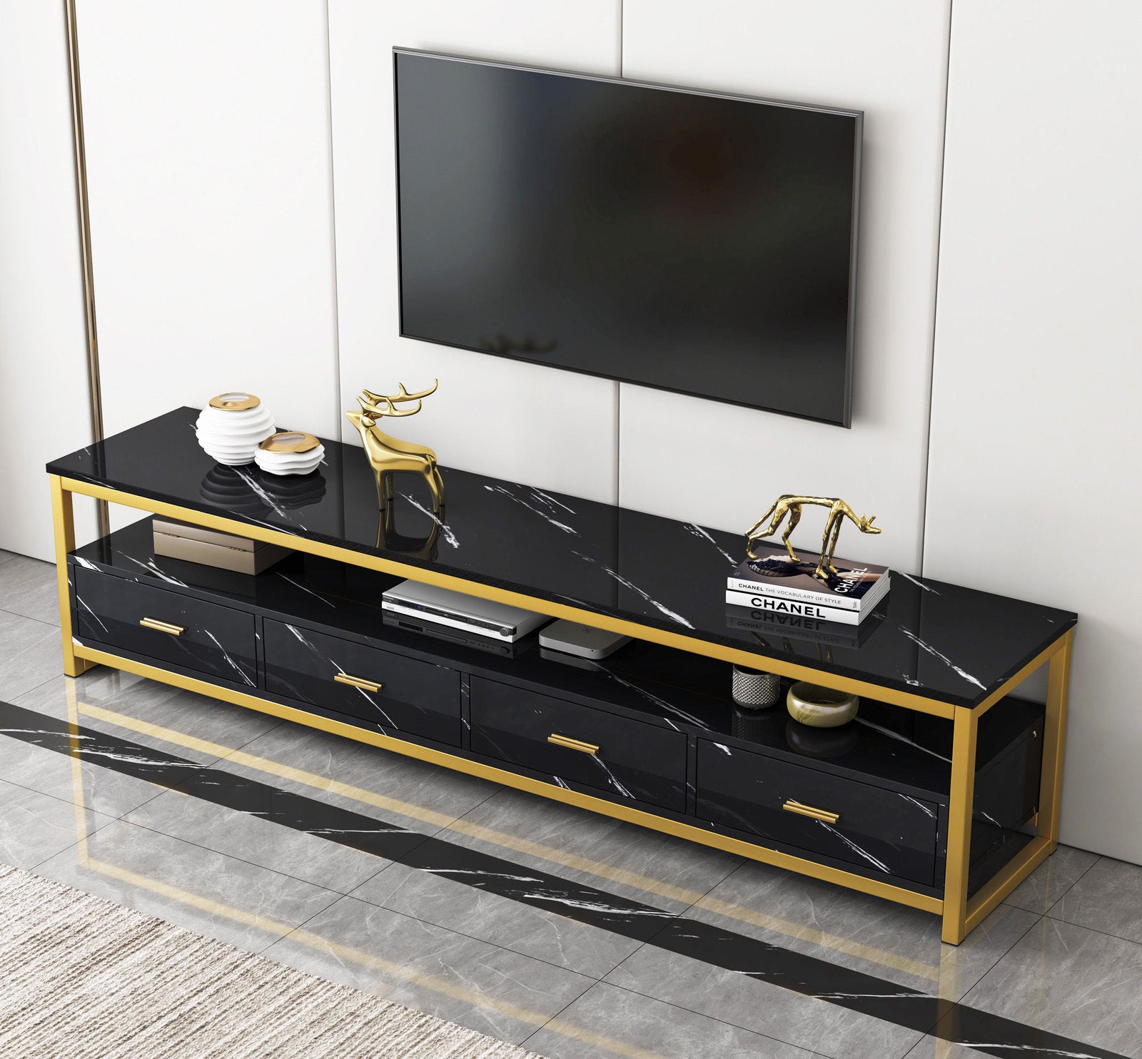 Elevate your entertainment space with the Synergy Marble look TV stand, the perfect blend of luxury and refinement. This handsome design exudes an elegant charm and brings a luxurious atmosphere to any room. Featuring a modern-inspired, simple, and glamorous design aesthetic, this striking TV cabinet is a true statement piece. With four spacious drawers and a generous top shelf, it provides ample space for storing books, framed photos, entertainment systems, and more while also helping you stay organized.