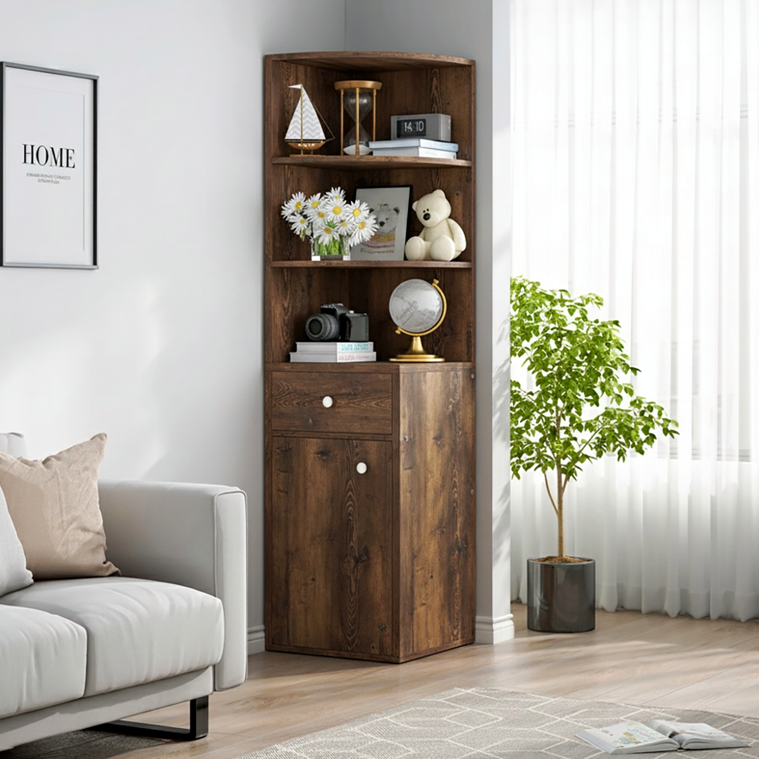 Turn an empty corner into a stylish storage hub with this Rustic Wood Corner Shelf. The rich, weathered wood and smooth, curved profile bring instant warmth and an inviting, lived-in look to any room, while the corner-hugging design frees valuable floor space. Show off décor on the three open tiers, keep daily essentials in the large drawer, and hide clutter in the two-tier cabinet. It’s a beautiful balance of form and function that keeps your home neat, calm, and inviting.