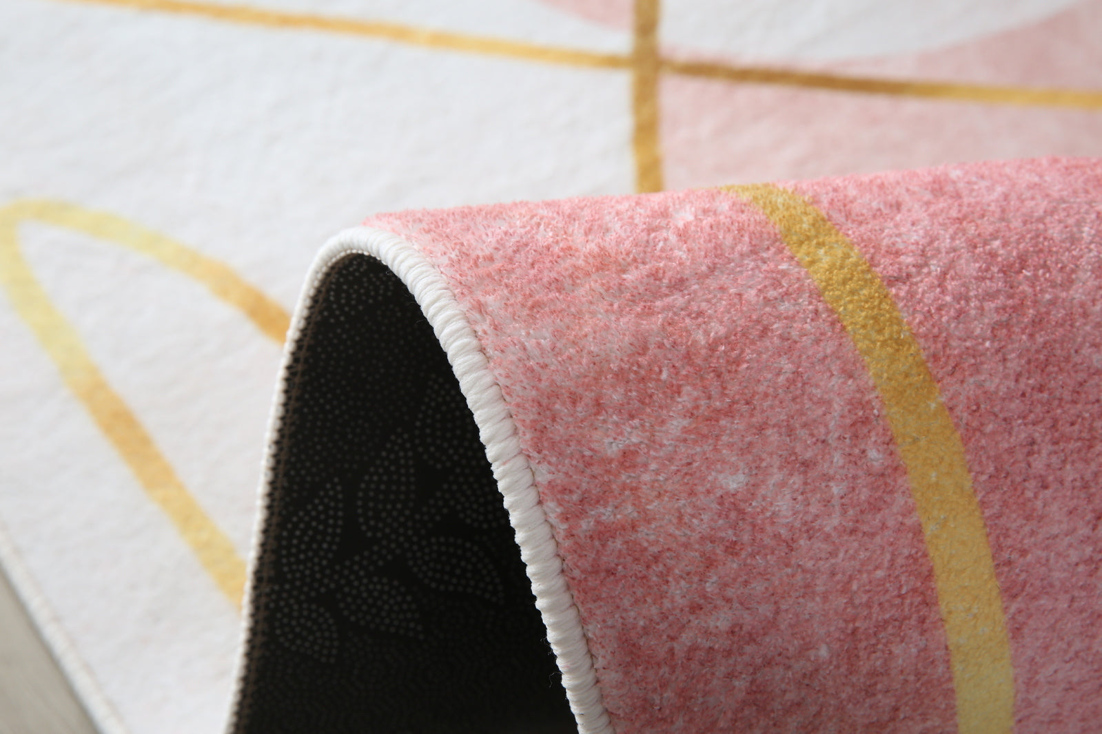 Upgrade your living space with the understated elegance and luxurious comfort of the deluxe faux wool area rug featuring a beautiful pink pattern with gold accents. Soft and plush to the touch, this stylish rug adds a delightful and sophisticated touch to any room, complementing any decor style. With a thickness of approximately 10mm, this luxury piece feels like walking on clouds and offers unmatched comfort.